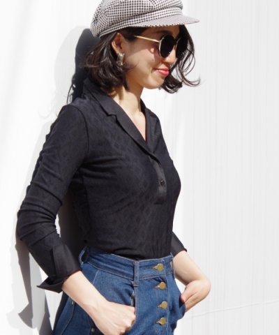 柄が特徴的な、イタリアンジャージーの長袖シャツ。鎖骨ラインが綺麗に覗くスキッパーデザインで、女性らしくエレガントな着こなしを楽しめます。すっきりとしたオープンカラーは意外性があり、フレッシュな装いを演出。優れたストレッチ性で動きやすく、着心地も抜群です。スリット入りのカフスはターンバックでき、こなれた雰囲気でお召しになれます。