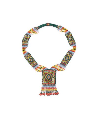 小粒のカラフルなビーズを敷き詰めたデザインが特徴的なネックレス。先端はフリンジのようなデザインにしています。存在感のある1品なので、シンプルなトップスに合わせてアクセントにするのがおすすめです。