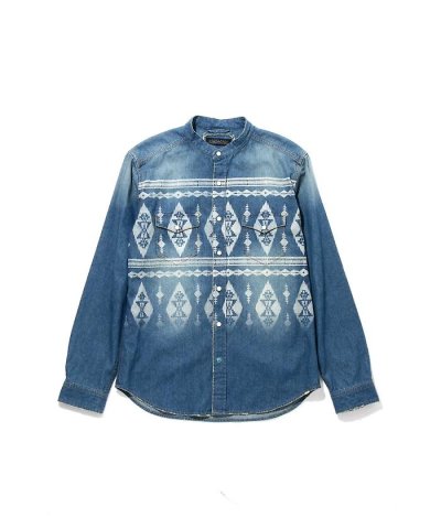 通称抜染と呼ばれるブリーチプリントを施したバンドカラーウエスタンシャツ。大柄のネイティブ柄をパネル状にプリントしています。ドット釦を使っていて、一番下の釦だけターコイズ色になっています。スタンドカラーが首元をすっきりとした印象に仕上げてくれ、一枚ですっきりと着て頂けます。前を開ければ軽い羽織としても使えるのでロングシーズン愛用して頂けるアイテムとなっています。