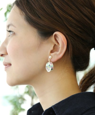 マルチカラーで仕上げたモザイクシェルピアスorイヤリング。内側に敷き詰めたシェルが光を浴びて多方に輝きを放ち、お顔回りを明るく華やかに彩ります。表面には樹脂加工を施しており、つるっとした滑らかな手触りです。トップに添えたパールが絶妙な引き立て役に。耳元でさりげなく揺れる大人カジュアルなアイテムです。