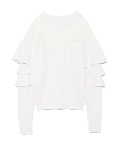 今季ニット素材は”フリル”がキーワード。三段になったフリルスリーブが、華やかな印象を与えてくれます。また、襟元はチュールレースに切り替えました。白のニットはドッドチュールを、赤のニットには花柄のチュールレース、黒のニットには格子状のチュールレースをあしらった、デザイナーの想いが込められた一品です。