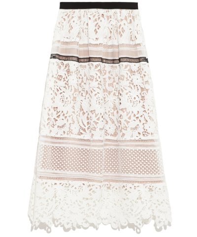 異なるレースとオーガンジーを切り替えたレーススカート。長めの着丈と広がり過ぎないボリューム感で甘くなりすぎないようにしています。インナーを少し短く作り、レースから品よく肌が透けます。シンプルなトップス合わせでも、コーディネートが華やぎます。