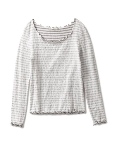 小さなスターモチーフを並べた、ひと味違うボーダー生地で仕立てたプルオーバー。くしゅくしゅっとしたシャーリング生地が、しなやかに伸びて肌へ沿い、タイトシルエットを描きます。ひらりと波打つメロウ始末の縁で、フェミニンなエッセンスをプラス。
