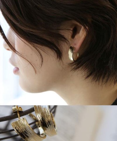 華やかな光沢感あるワイドシルエットのピアス。 モチーフの表面には縦に筋のような加工が施され、 様々な角度から光を浴びる度、立体感ある綺麗な輝きを放ちます。 また、先端に向かって細くなっているモチーフが女性らしい横顔に。 カジュアルコーデのアクセントのアクセントに、 エレガントコーデにも負けない存在感で使いまわし抜群のアイテムです。