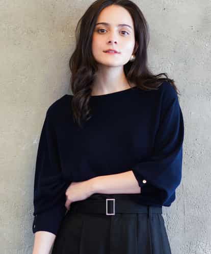 ゆったりとしたドルマンスリーブが1枚でこなれ感たっぷりのニットプルオーバー。畦組織の表面感のあるニットは女性らしい雰囲気に。やわらかでとろみのある素材は、ドルマンスリーブも肌馴染み良く着こなせます。きれいめな印象のニットなので、タイトスカートなどのきちんとボトムとも相性抜群。袖口のゴールド釦もさりげないアクセントに。※屋外での撮影は色味が多少異なる場合がございます。商品の色味は、スタジオ撮影の画像をご参照ください。 ※サンプルでの撮影となるため、実際にお届けする商品と仕様やサイズが異なる場合がございます。