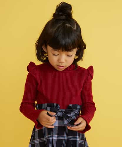 [100-130]【洗える】ショルダーフリルリブタートルニット[WEB限定サイズ] ワイン 120