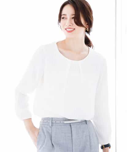 お仕事着にもおすすめストライプ柄ブラウソー 主張しすぎない織り柄のさりげないストライプ柄のブラウソー。ジャケットと着合わせて上品に決まります。裏地には伸縮性のあるカットソー素材を使用し、着心地の良さも魅力的。袖にシフォンを重ねることで透け感も気にせず着用いただけます。袖口はタックでふくらみをつけることで女性らしい印象に。ジャケットやカーディガンのインナーとしても、1枚着トップスとしても活躍してくれるカットソーです。※屋外での撮影は色味が多少異なる場合がございます。商品の色味は、スタジオ撮影の画像をご参照ください。 ※サンプルでの撮影となるため、実際にお届けする商品と仕様やサイズが異なる場合がございます。
