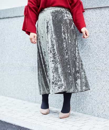 ウエストゴムのロングスカート。 今年注目のベロア素材です。毛並のランダムな乱れが見る角度によって光沢を変化させる起毛生地です。 落ち感があるのでボリュームをおさえたスッキリラインで大人な着こなしができるスカート。