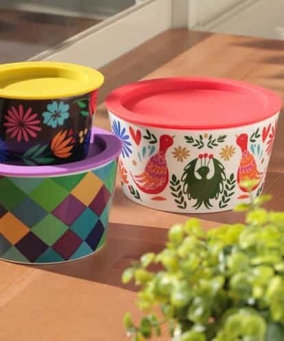植物や鳥、チェック柄をモチーフにした目を惹く柄がキュートな陶器のフードコンテナです。小中大と3つのサイズバリエーションのセットが使い勝手も良く、スタッキングして収納出来るのも嬉しいポイントです。シリコン製のフタが洗いやすく、本体はそのままボウルとしてもお使い頂けます。これからのシーズン、プレゼントにピッタリです♪ ☆クリスマスまでにお届け・ラッピング可能です☆ 店舗へのお問い合わせの際は、以下をお伝えください。 商品コード: GFYAE26030