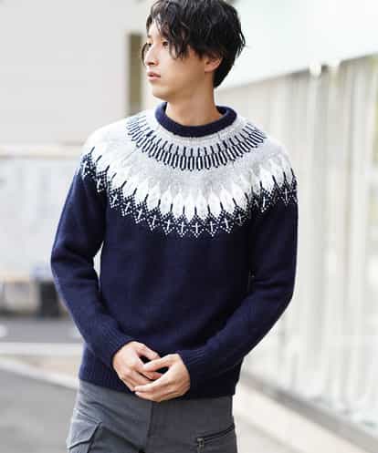 【こだわりの素材】 (アクリル/ナイロン/ポリエステル/ポリウレタン)の4者混紡糸を使用。非常に通気性に優れ、伸縮性、軽さが特徴のあるふわふわっとしたスポンディッシュな救心編みのニットセーターです。 しっとりとした品の良いタッチ感。暖かな風合いが心地良く、優しい肌さわりと綺麗な発色が特徴です。 【こだわりのデザイン】 救心編みで胸元にオリジナルのノルディックパターンが入ったトレンドをおさえた今年らしい表情がポイントです。 存在感抜群のルックスで、タイトからワイドまで、幅広いパンツとのコーディネートをお楽しみいただけます。 大切な方への贈り物としても最適なアイテム。