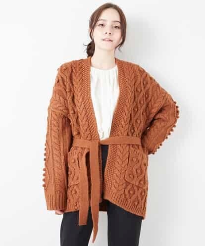 ザックリとローゲージで編まれた、秋口のアウターにも最適なニットカーディガンです。ケーブルや小さなポンポンが印象的な編地で、秋冬らしい装いにまとめてくれるアイテムです。ウエストベルト付きで、後ろで結んでフロントオープンで合わせたり、ベルトをフロントで締めて閉じたスタイリングなど、2wayで楽しんで頂けます。ヒップが隠れる丈でとっても暖かなカーディガンです。model:H165 B79 W60 H88 着用サイズ:M