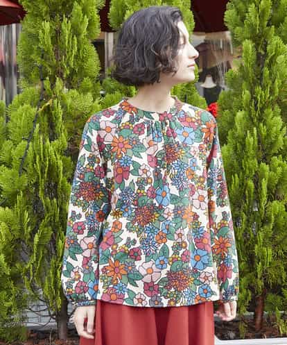 過去に人気のあった柄を使用したアーカイブプリントのブラウスです。ホコモモラらしい花柄や鳥さん柄がコーディネートのアクセントとなり、主役級のアイテムです。首周りに寄せたギャザーのデザインで、柔らかい印象のあるシルエットに仕上がっています。パンツやスカートとの合わせはもちろん、トレンドのジャンパースカートのインナーとしてもおススメです! model:H167 B80 W58 H87 着用サイズ:M