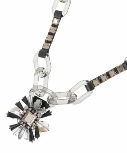 煌びやかなペンダントトップと透明感のある樹脂チェーン使いが豪華なペンダントネックレス。 大き目のビジューの周りをガラスビーズを上品にあしらい、特別な日に相応しい、好印象な一品です。