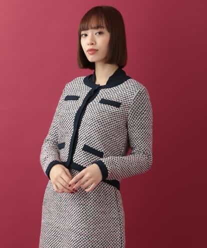 ラメ糸を織り込んだまるでツイードのようなニット地のジャケット。ノーカラーデザインで首回りはスッキリ。袖口や裾周りのカラーリングが全体を引き締めてくれます。デニムなど、カジュアルなボトムとも好相性でミックスコーデにも最適なアイテムです。【VVFCG11590】とセットアップでの着用もおすすめです。model:H164 B82 W59 H88 着用サイズ:M